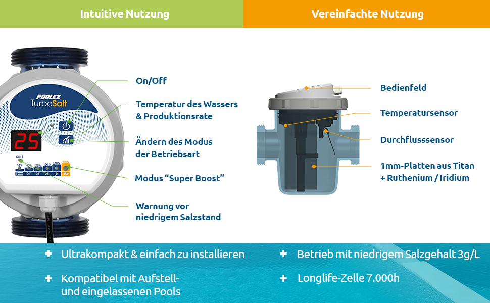 Mit einer Mindestbetriebskapazität von 7000 Stunden muss die Turbo Salt Zelle des Turbo Salt erst nach mehreren Jahren Gebrauch ausgetauscht werden.