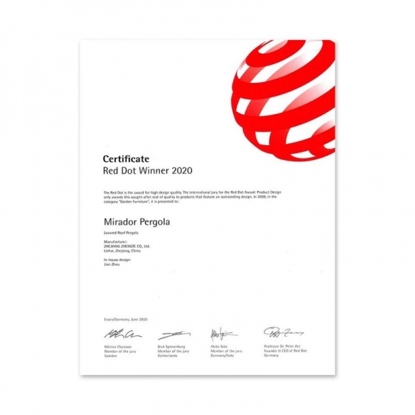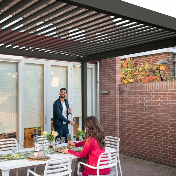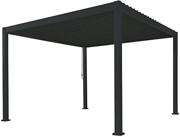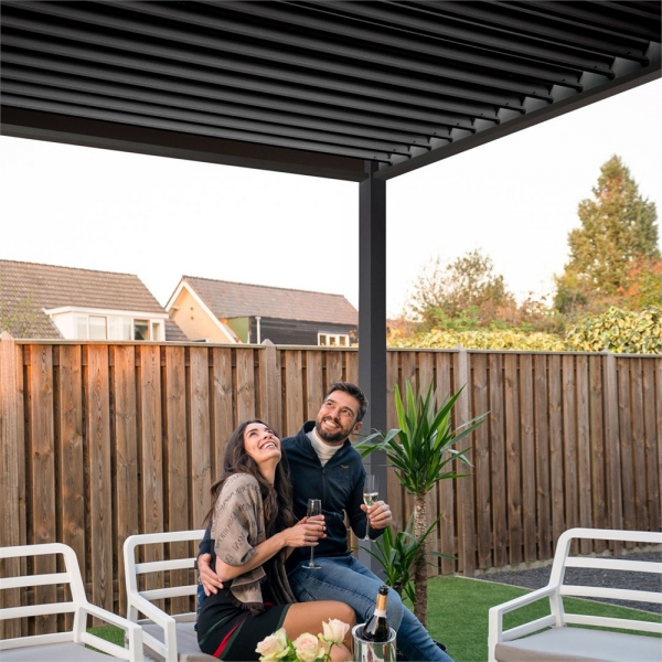 MIRADOR Pergola Anthrazit 360x360x250cm Die perfekte Erweiterung des Wohnbereichs. Das einzigartige, kippbare Lamellendach der Mirador Pergola bietet viele Schutzmöglichkeiten. Dank der benutzerfreundlichen Lamellen können Sie wählen, ob Sie in der Sonne oder im Schatten sitzen möchten. Auch bei Regen bleiben Sie dank des Kippdaches trocken. Wenn die Lamellen geschlossen sind, ist das Dach wasserabweisend. Das Wasser wird durch das innovative integrierte Wasserableitungssystem abgelassen. Diese solide Dacheindeckung ist auch für extremere Wetterbedingungen gedacht. Freistehend oder verbunden mit einer bestehender Bebauung, ist sie die perfekte Erweiterung Ihres Wohnbereichs.
