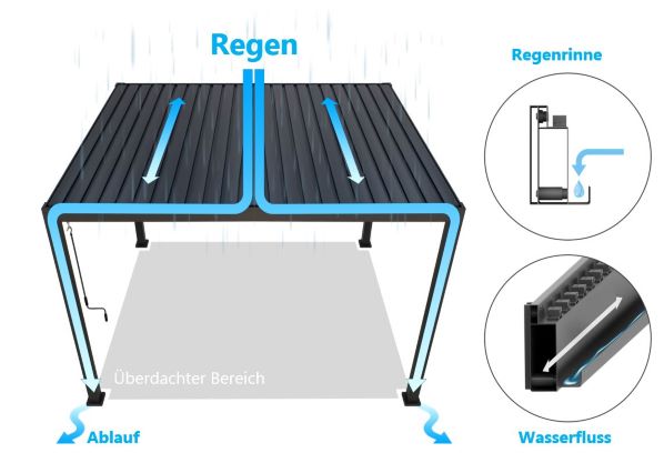 Wenn die Lamellen geschlossen sind, ist das Dach vollständig wasserabweisend. Das Wasser wird durch das innovative integrierte Wasserabführsystem direkt kontrolliert abgeführt.
